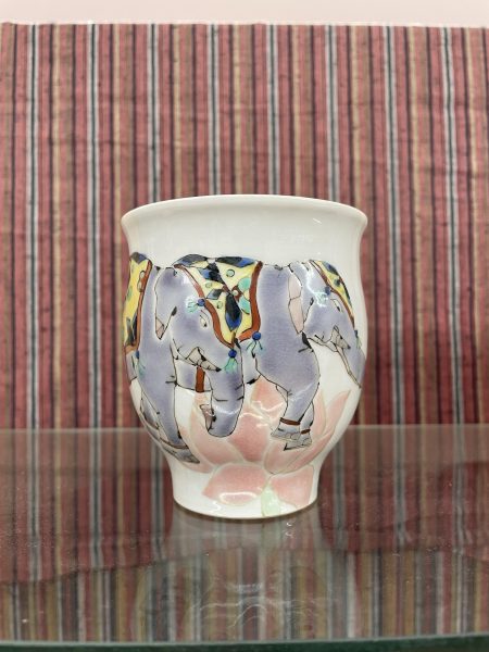 象のグレーと蓮の絵が柔らかく、インドの織物がアクセントとなった華やかなカップです。